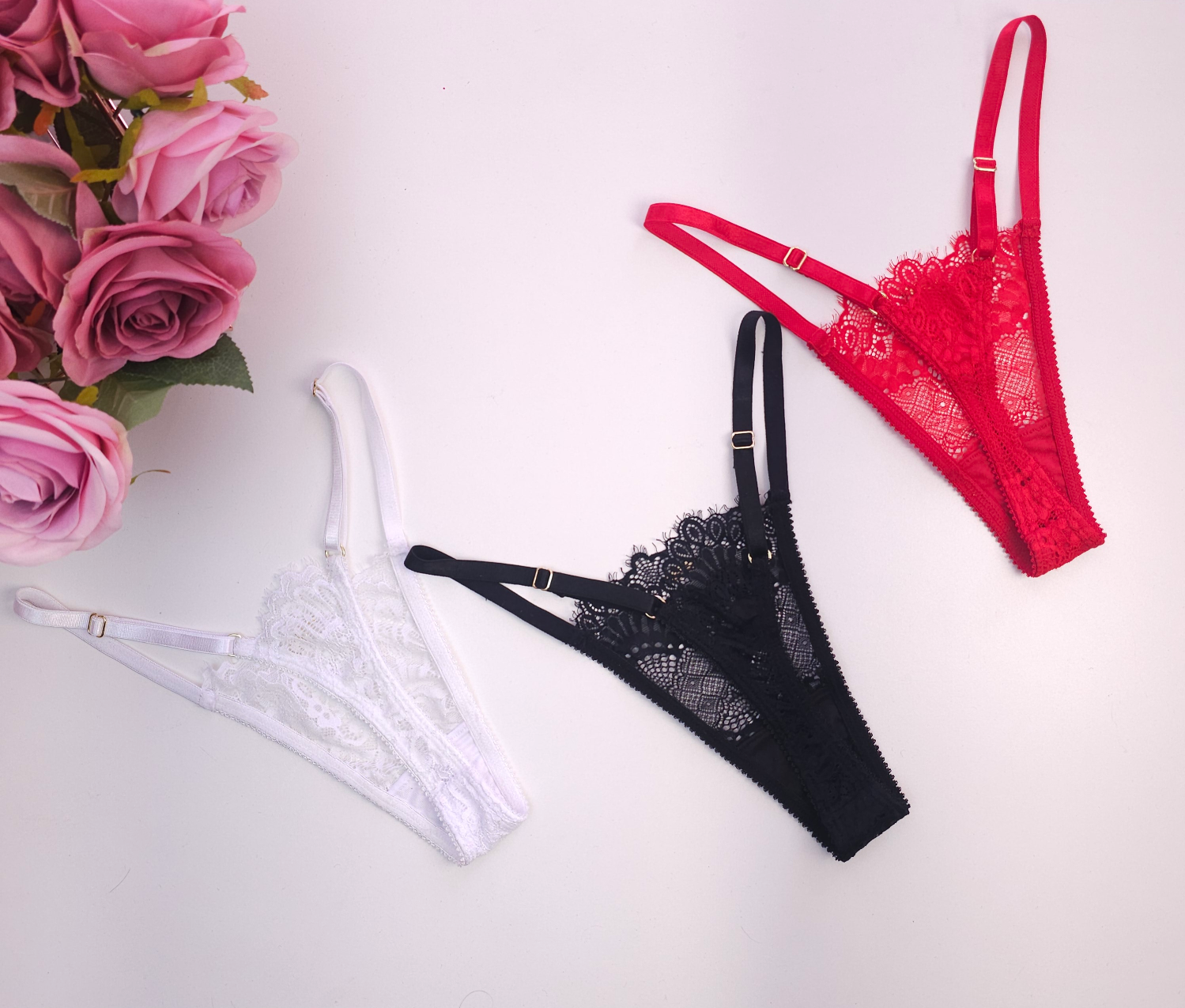 Están elaborados en blonda, con refuerzo en algodón, tiranta nylon de 1cm y caucho de 1cm por contornos de piernas y cintura.